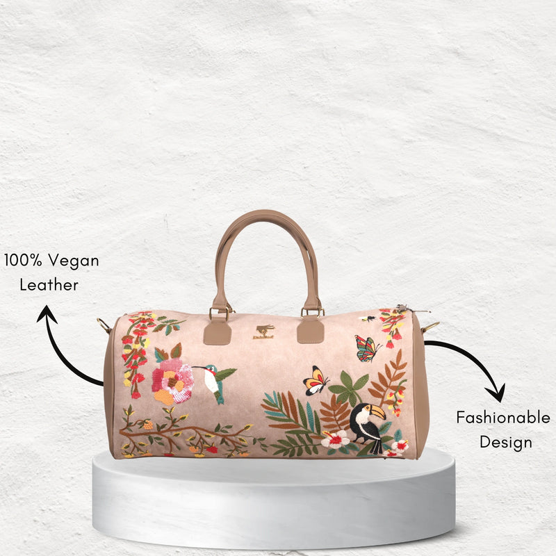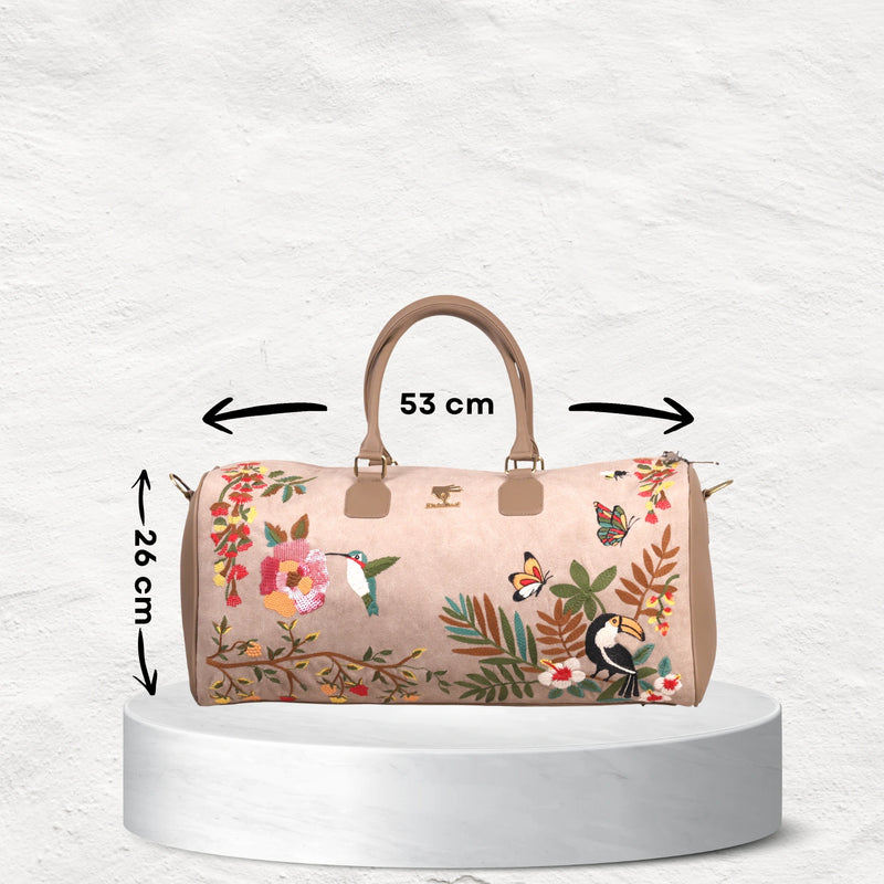 The Mystic Garden Duffel Bag in a calming beige tone with floral embroidery is crafted for women who want their travel bags to reflect grace and individuality. Designed with a roomy interior and soft finish, it’s equally perfect for short getaways, festive occasions, or carrying daily essentials in style.