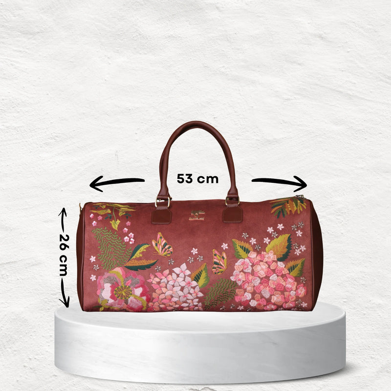 The Blossom Wood Duffel Bag in a warm brown shade with floral embroidery is the perfect blend of earthy elegance and everyday functionality. Spacious yet stylish, it’s made for women who want a bag that looks graceful at festive events but also works effortlessly for travel, gym, or day-to-day needs.
