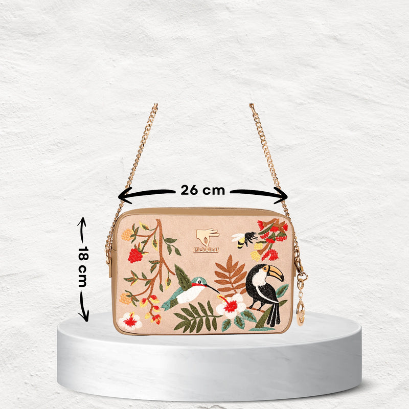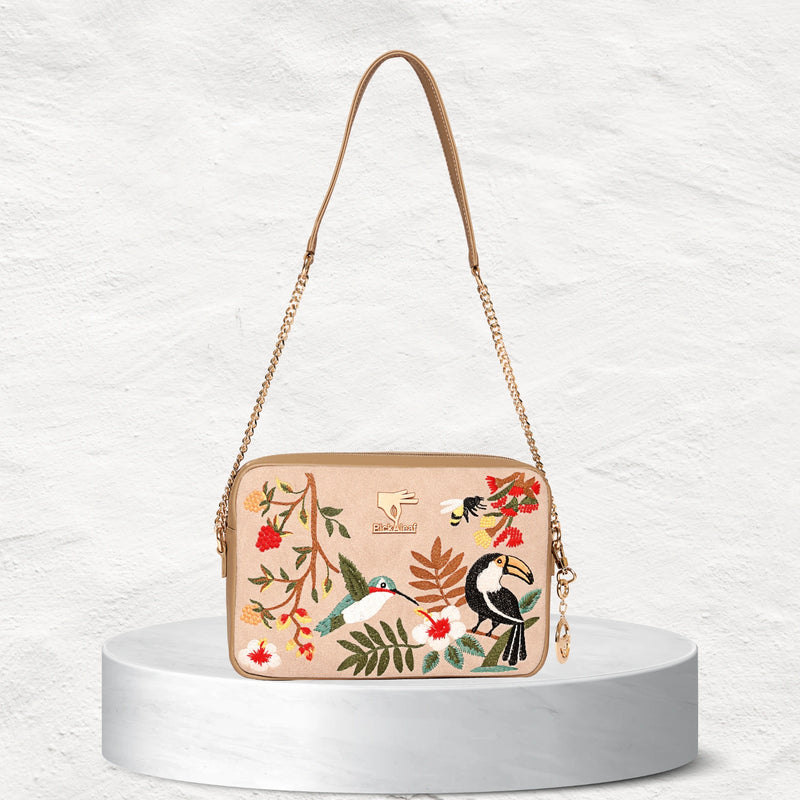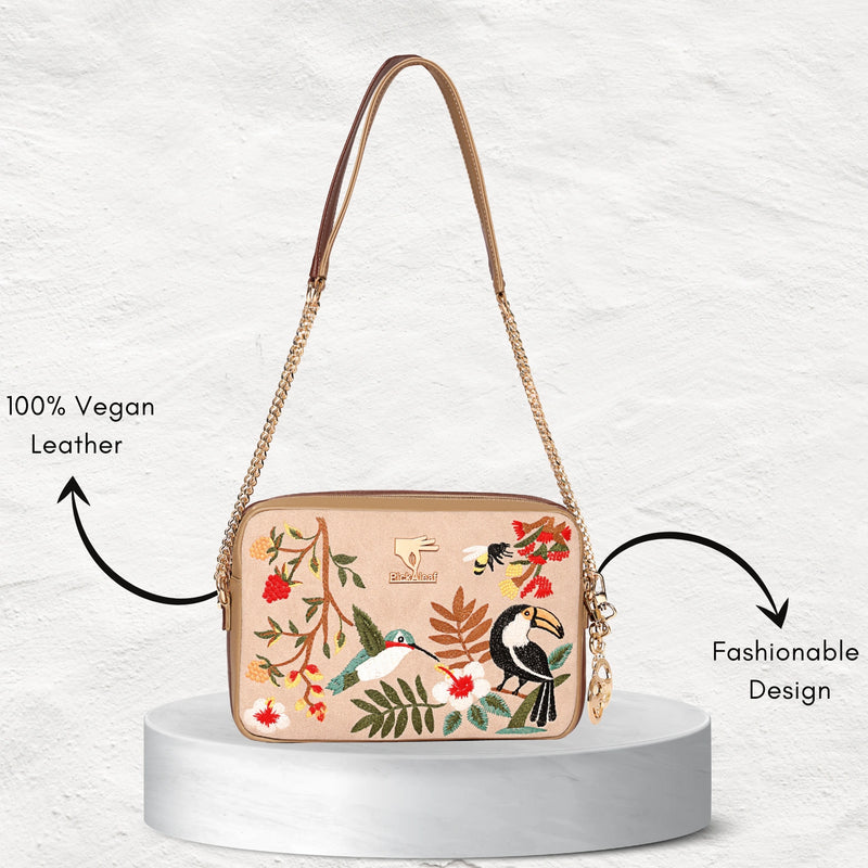 The Blossom Wood Sling Bag – Special Edition blends soft suede velvet with intricate embroidery and vegan leather detailing for a look that’s both refined and versatile. Lightweight yet luxe, it’s crafted to move effortlessly from work meetings to brunch dates and festive evenings — carrying your essentials in pure style.