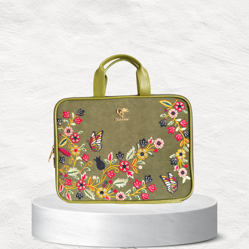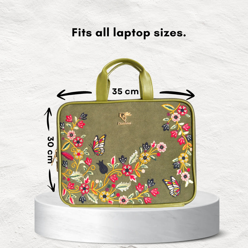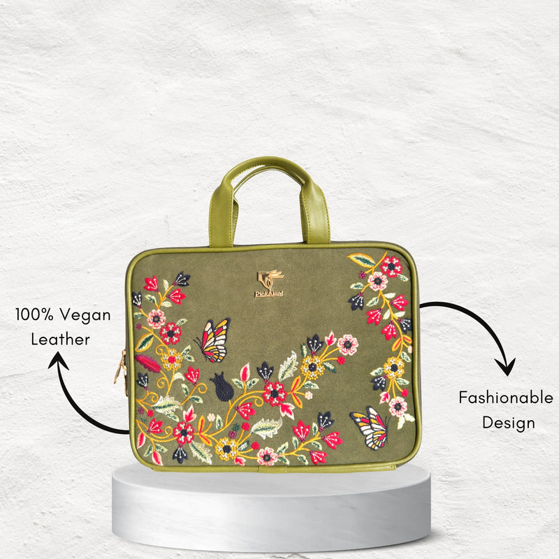 Olive green Waves embroidered laptop sleeve for office and travel.