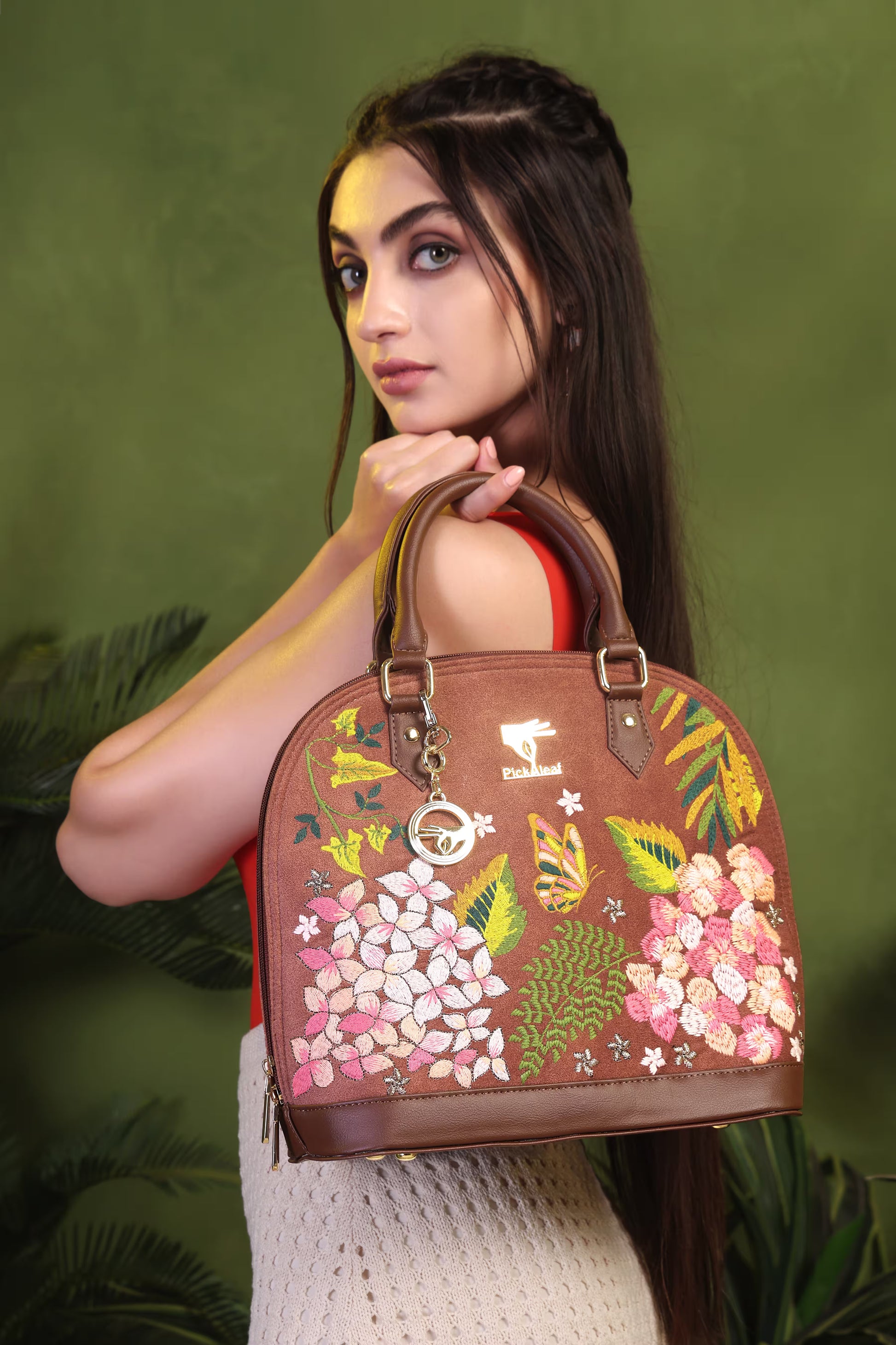 The Blossom Wood Handbag in warm brown with floral embroidery is crafted for women who appreciate nature’s charm in their accessories. Compact yet refined, it’s a versatile bag that adds earthy sophistication to both daily use and festive occasions.