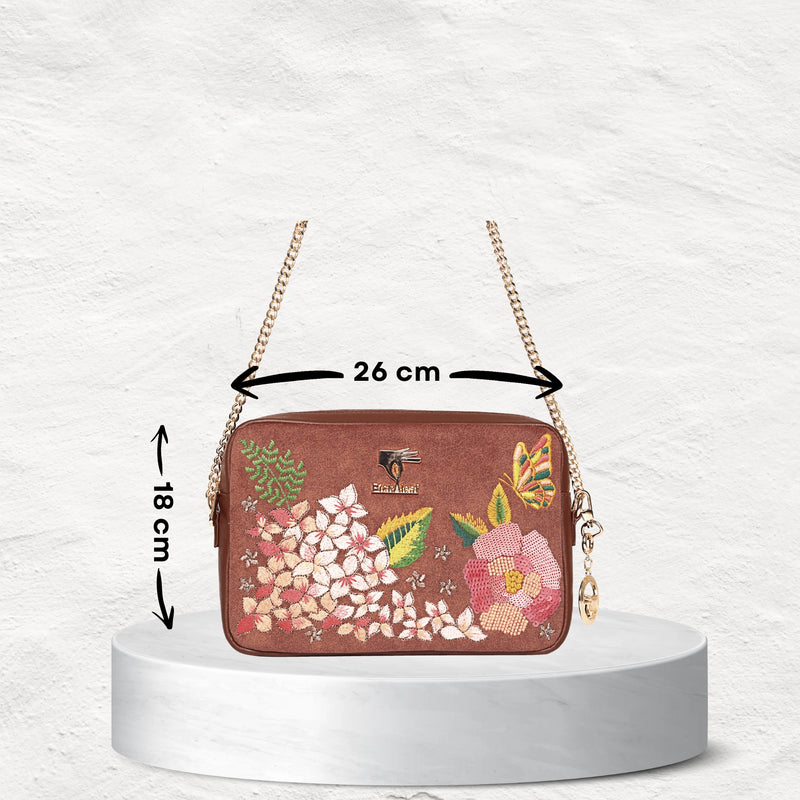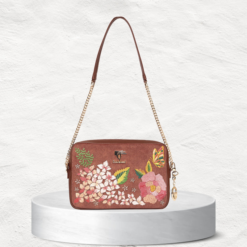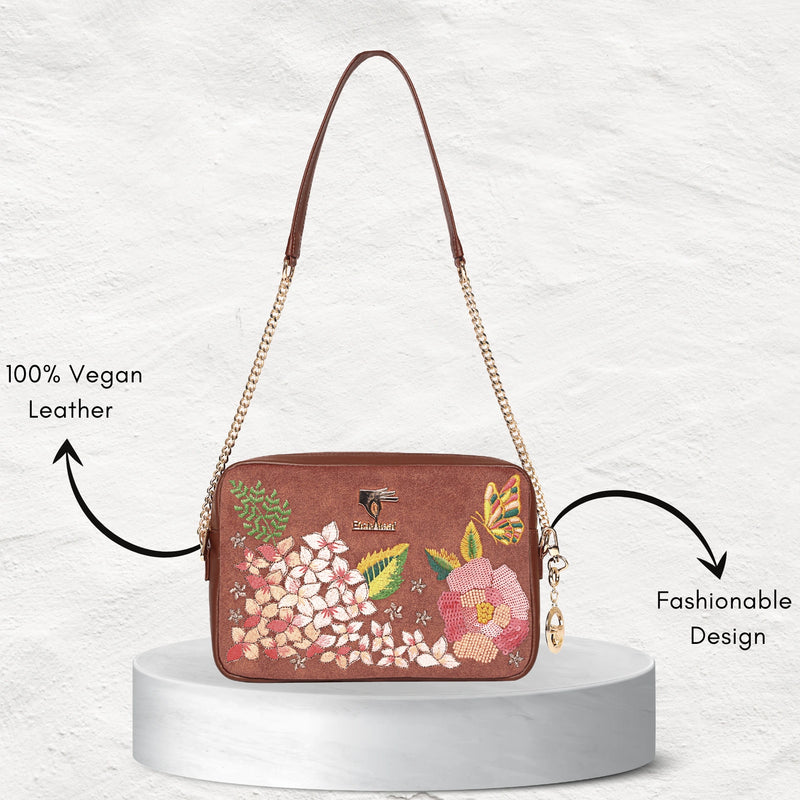 The Blossom Wood Sling Bag – Special Edition blends soft suede velvet with intricate embroidery and vegan leather detailing for a look that’s both refined and versatile. Lightweight yet luxe, it’s crafted to move effortlessly from work meetings to brunch dates and festive evenings — carrying your essentials in pure style.