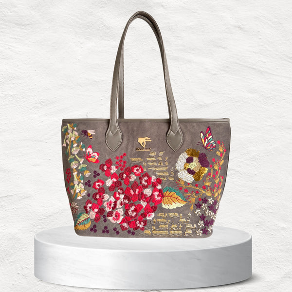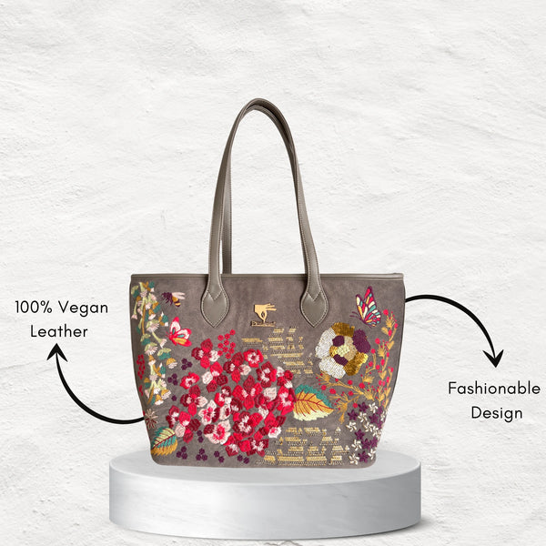 This grey laptop tote from PickAleaf is crafted in vegan leather embroidery with a structured shape that keeps your essentials neatly arranged. It fits a laptop, documents, and daily items without feeling bulky, making it a dependable choice for office routines and commutes.