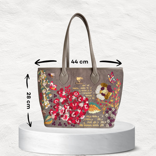 Size: 44cm x 28cm x 17cm (LxHxD) Weight of the bag: 750g Material: Embroidery on Suede Velvet Finish Soft and Rich Fabric, Vegan leather, Premium threads Inside: 1 zipper pocket Premium hook closure Vegan leather Flat handles Care Guide: Vacuum clean to remove dirt. To remove stains, gentle use of soft damp cloth soaked in mild soapy water in the required area.