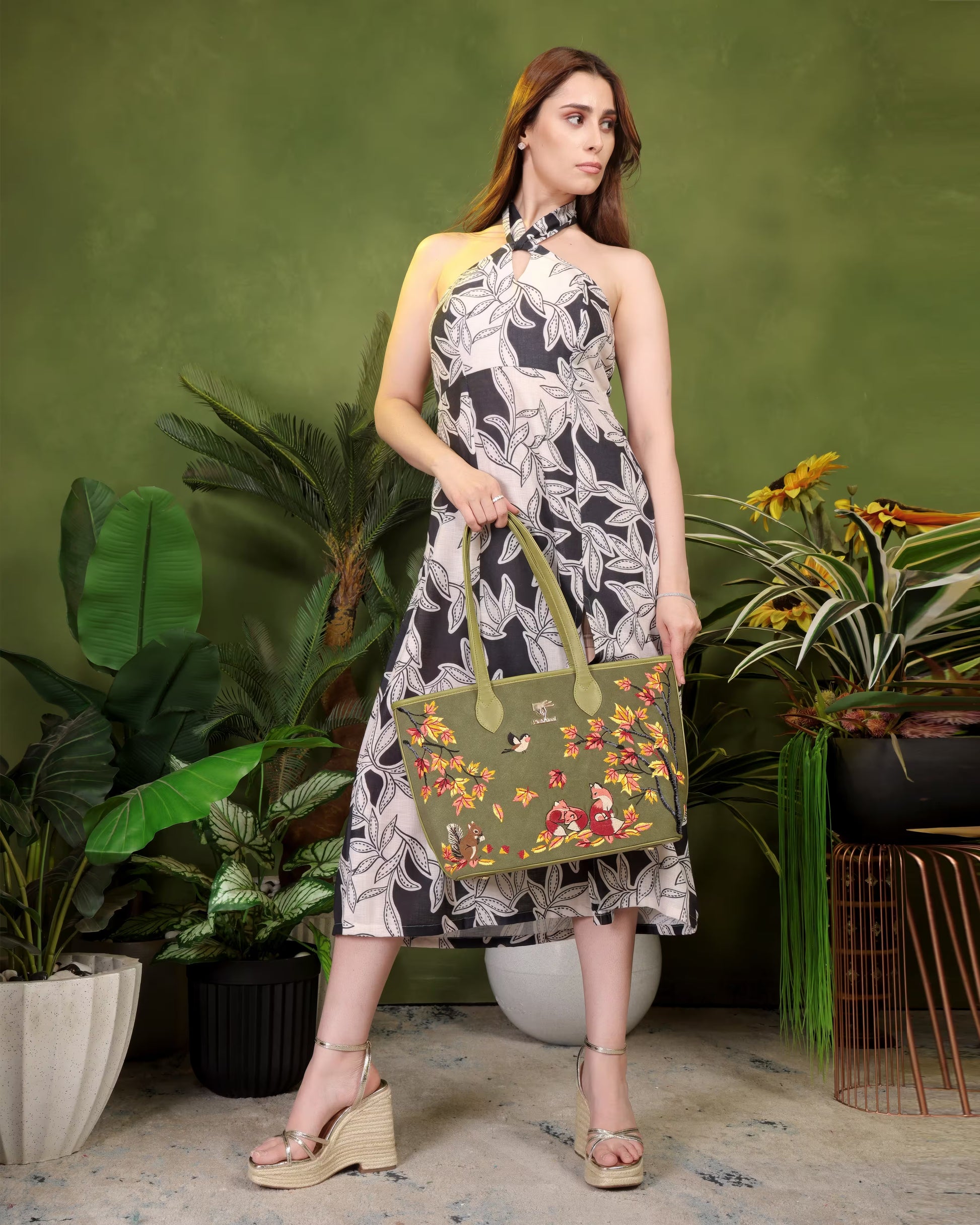 Olive Green Embroidery Autumn Whisper Tote Bag | Work, Travel & Office