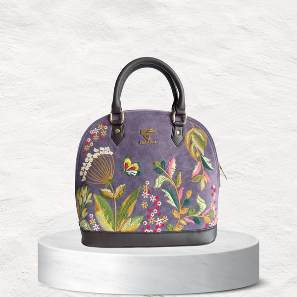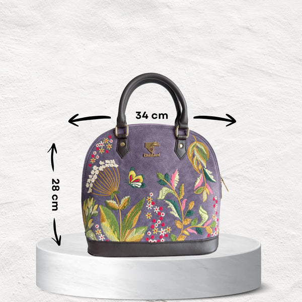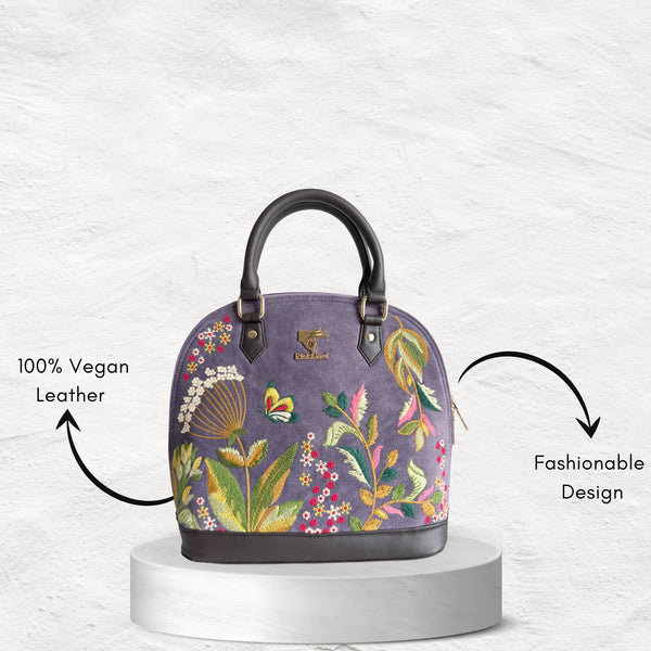 Purple embroidered top handle bag for women in vegan leather by PickAleaf, cruelty free with floral design for weddings and parties